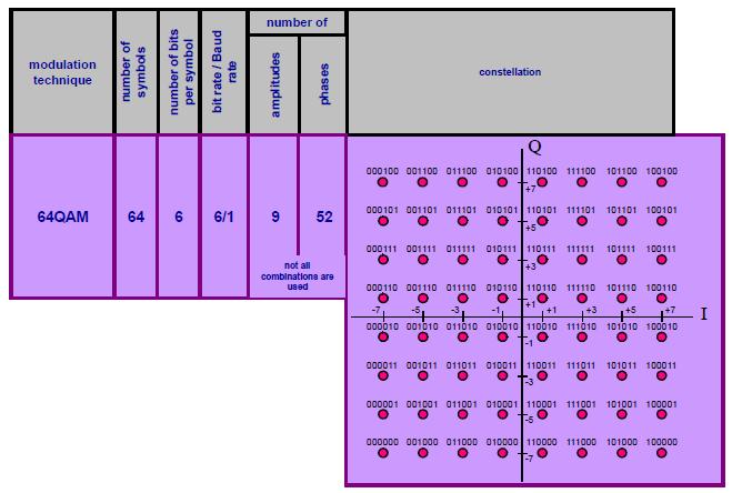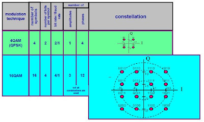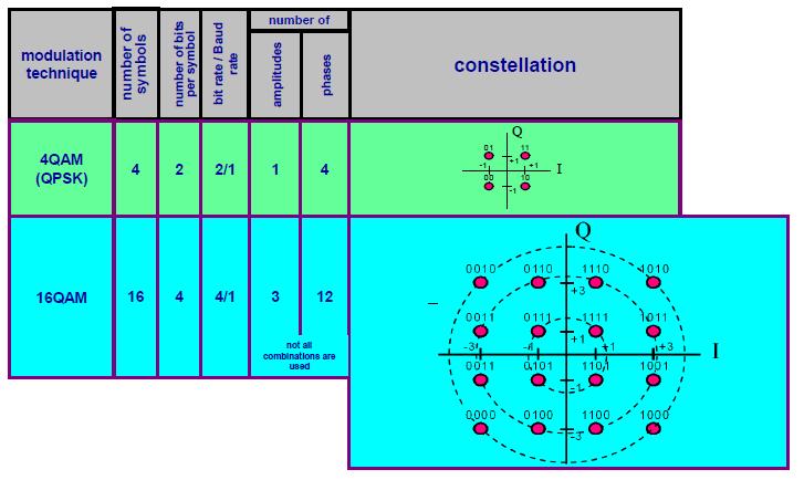 - In LTE, 16-QAM uses a constellation with 16 points, allowing each symbol to represent 4 bits. Similarly, 64-QAM has 64 points, allowing each symbol to represent 6 bits. The use of higher-order QAM increases the data rate but makes the system more susceptible to noise and interference.