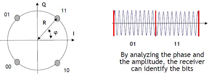 The QPSK is the most robust modulation. It can be represented by a constellation:The radius, R, represents the amplitude.The angle, ?, represents the phase.
