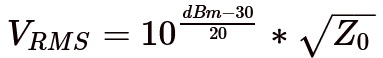 Im ersten Schritt wird die Leistung mithilfe der Formel P(W) = 10^(dBm/10) / 1000 von dBm in Watt umgerechnet. Im zweiten Schritt wird die Effektivspannung (Vrms) berechnet, indem die Quadratwurzel aus dem Produkt aus Leistung in Watt und charakteristischer Impedanz (R) gezogen wird. Diese Methode gewährleistet eine genaue Konvertierung für HF- und elektronische Messungen.