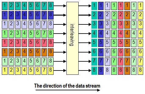 Por lo tanto, el entrelazado puede superar el rápido desvanecimiento causado durante la transmisión de señales en el aire. El código de entrelazado rara vez funciona para corregir códigos de error causados por un desvanecimiento lento, porque el desvanecimiento lento puede resultar en códigos de error consecutivos prolongados , incluso todo el marco puede tener error. Por lo tanto, se producirán errores consecutivos Códigos después del desintercalado. La figura anterior es el intercalado más simple y el intercalado en una aplicación real es mucho más complejo.
