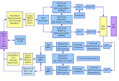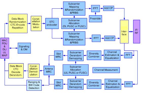 il formato della MAC PDU. La MAC PDU organizza la dimensione del blocco dati in base ai risultati di allocazione delle risorse radio al livello MAC. - Dopo che i pacchetti di dati sono stati elaborati attraverso la codifica del canale, la modulazione e l’IFFT a livello fisico, il CP viene aggiunto per formare i simboli OFDMA integrati nel dominio del tempo e quindi i simboli vengono trasmessi nella struttura del sottoframe del downlink tramite RF in lavorazione.