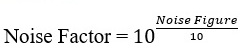 Deze formule zet het ruisgetal (NF), uitgedrukt in decibel (dB), om in de lineaire ruisfactor (F). De ruisfactor kwantificeert hoeveel een apparaat of systeem de signaal-ruisverhouding verslechtert. Door 10 te verheffen tot de macht NF gedeeld door 10, verkrijgen we de lineaire representatie die wordt gebruikt bij berekeningen op systeemniveau.