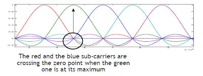 - De interferenties tussen kanalen (of inter-subdraaggolven) worden geannuleerd omdat ze zich op een zodanige manier bevinden dat wanneer er een piek is voor een bepaalde subdraaggolf, de aangrenzende subdraaggolven nul zijn.