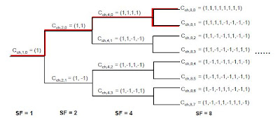 - In de codeboom worden de kanalisatiecodes individueel beschreven door Cch,SF,k, waarbij SF de spreidingsfactor van de code is en k het codenummer, 0 ? k? SF-1. Een kanalisatiereeks moduleert de bit van één gebruiker. Omdat de chipsnelheid constant is, maken de verschillende codelengtes verschillende gebruikersdatasnelheden mogelijk. Lage SF’s zijn gereserveerd voor diensten met een hoog tarief, terwijl hoge SF’s voor diensten met een laag tarief zijn.