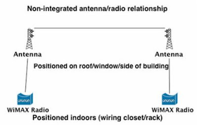 WiMAX mimarisi, çok basit bir şekilde ifade edilirse, inşa edilmiştir iki bileşene dayanmaktadır: radyolar ve antenler. Çoğu WiMAX ürünü, antenden ayrı bir baz istasyonu radyosu sunar. Bunun tersine, birçok CPE cihazı da aşağıdaki şekilde gösterildiği gibi binanın dışında bir anten ve içeride abone istasyonu bulunan iki parçalı çözümlerdir.