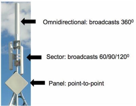 WiMAX antenleri, tıpkı araba radyosu, cep telefonu, FM radyo veya TV antenleri gibi,Belirli bir uygulama için performansı optimize etmek üzere tasarlanmıştır. Yukarıdaki şekil WiMAX dağıtımlarında kullanılan üç ana anten tipini göstermektedir. Yukarıdan aşağıya altta çok yönlü, sektör ve panel anteni bulunur ve her birinin belirli bir işlevi vardır.
